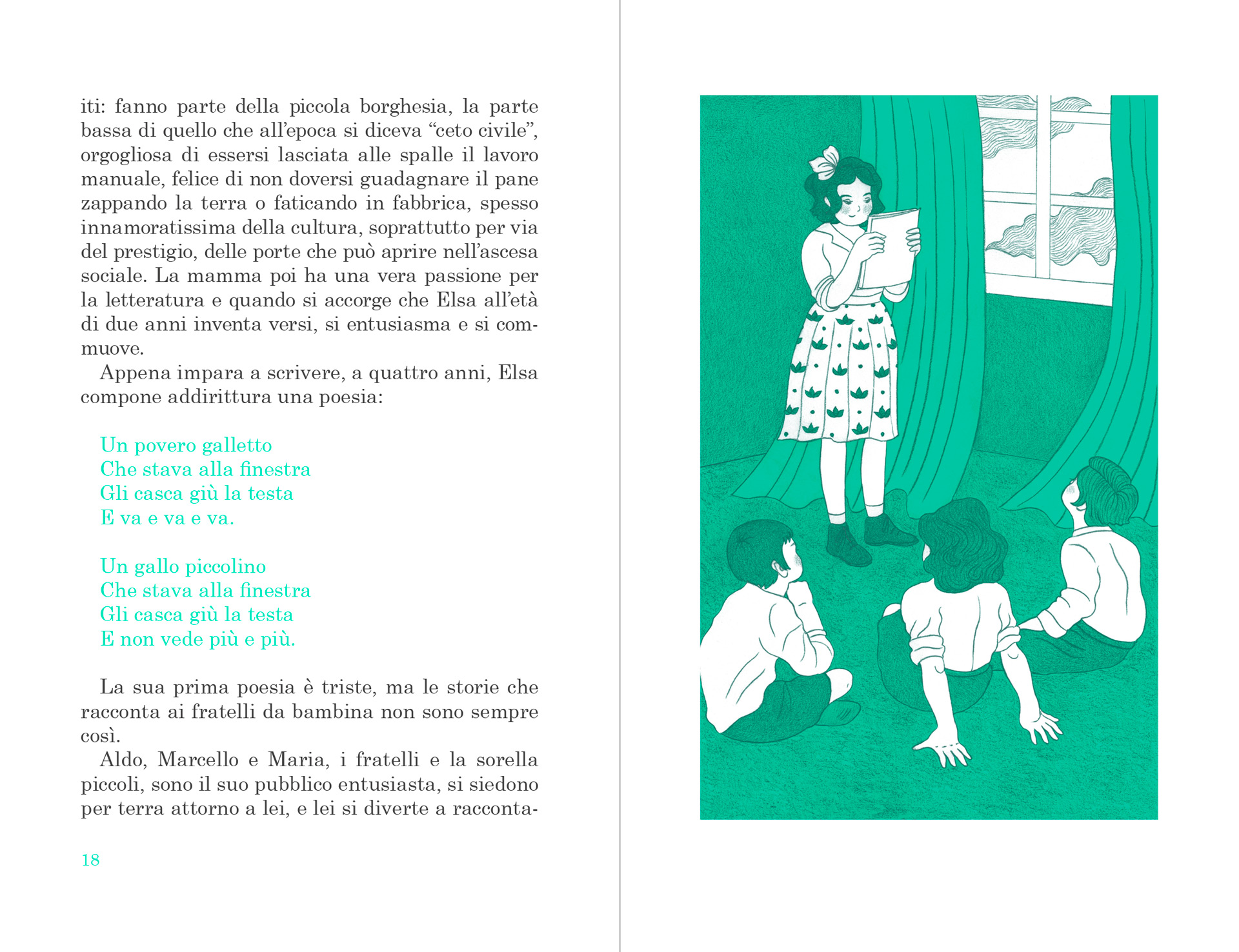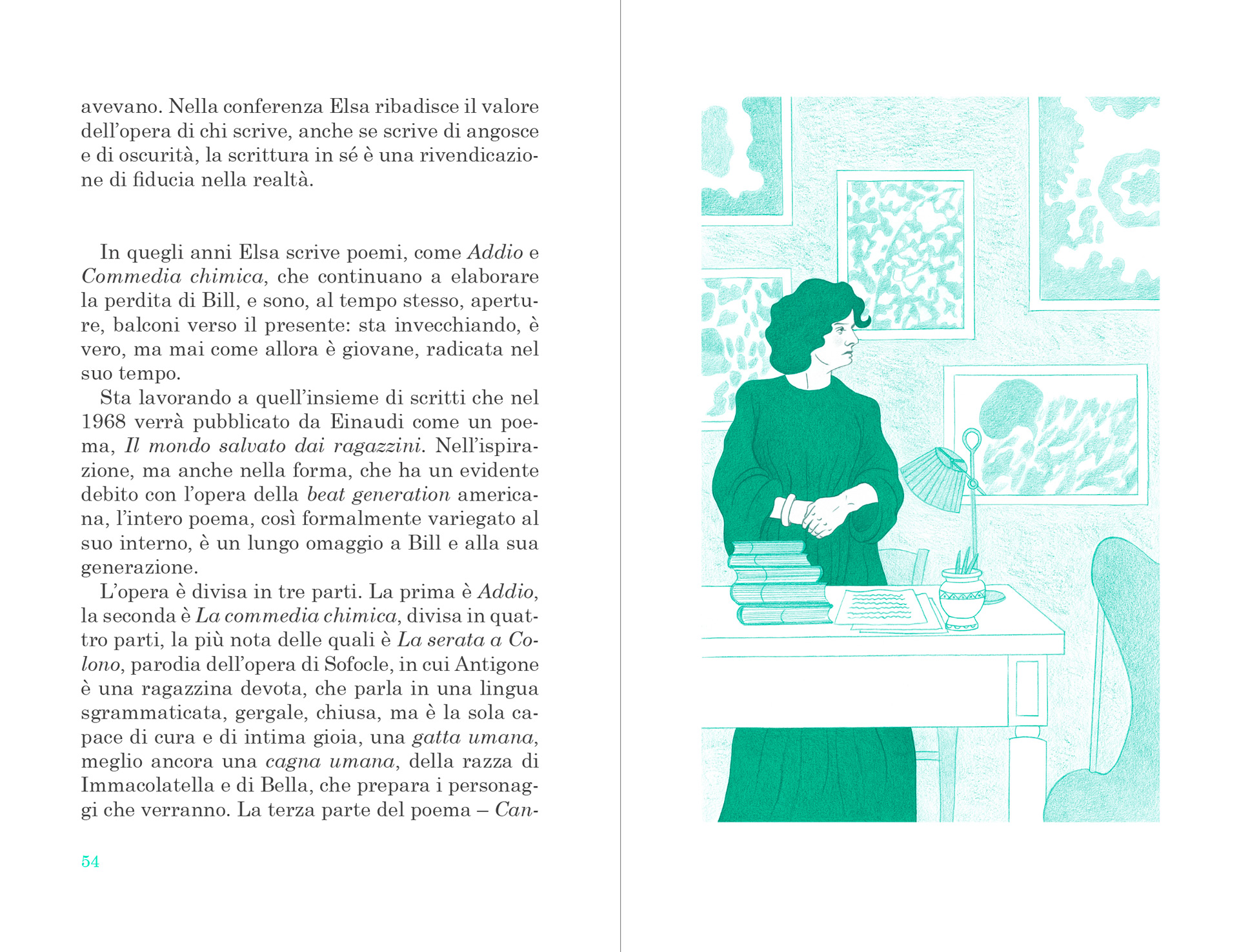 “Quando uscì La Storia avevo nove anni. Elsa Morante, con il suo viso triangolare, i libri e il gatto era una figura familiare a casa mia come in tante altre case. Nel 1957 il suo secondo romanzo, L’isola di Arturo, aveva vinto il premio Strega, e noi bambini che a quel tempo neanche eravamo nati conoscevamo le sue foto; insieme a Pasolini e a Moravia componeva la triade della letteratura italiana, gli autori che non si poteva fare a meno di conoscere. Dei tre, Elsa Morante era la più difficile da interpretare, carezzevole e irosa, sorniona, severa. Insieme a Natalia Ginzburg e a una manciata di altre donne era stata un’apripista, una donna che aveva creato uno spazio nella vita pubblica, ampio, che prima non c’era, e che sarebbe servito un giorno a noi bambine (di sicuro sarebbe servito a me, anche se a quel tempo ancora non lo sapevo).”
