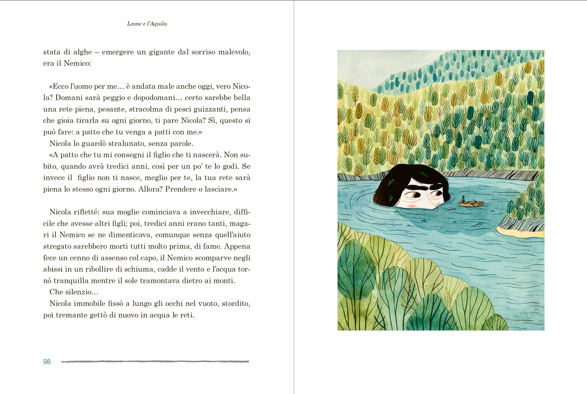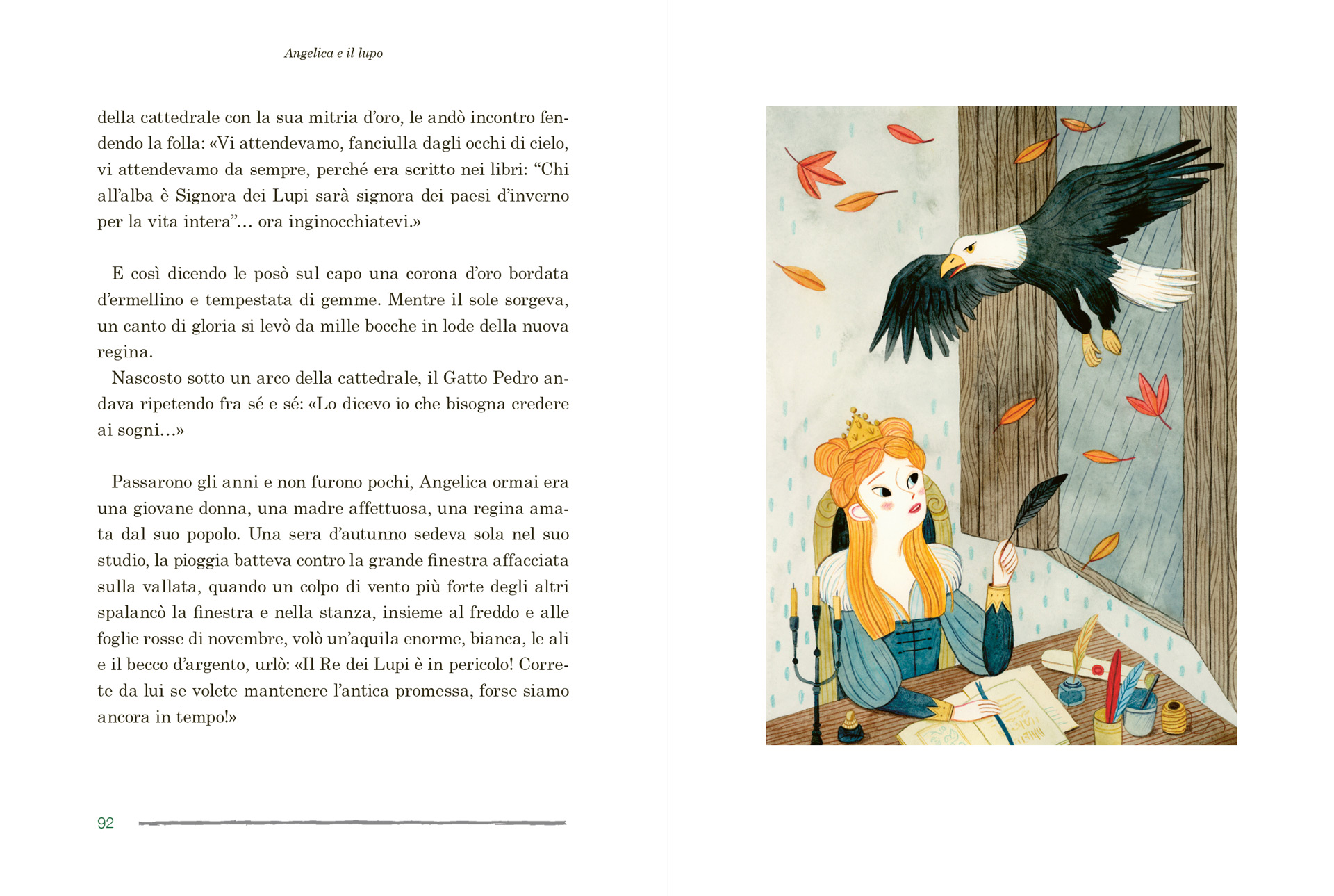 “Volarono fino in cima a una montagna altissima, coperta di neve, dove un castello dalle mille torri rideva al sole. L’Aquila entrò da una grande finestra spalancata […] poi, in uno scintillio di polvere d’oro, si trasformò nella più bella delle fanciulle e si presentò: «Io sono la Fata Aquilina. E tu, Leone, tu sarai il mio sposo.»”