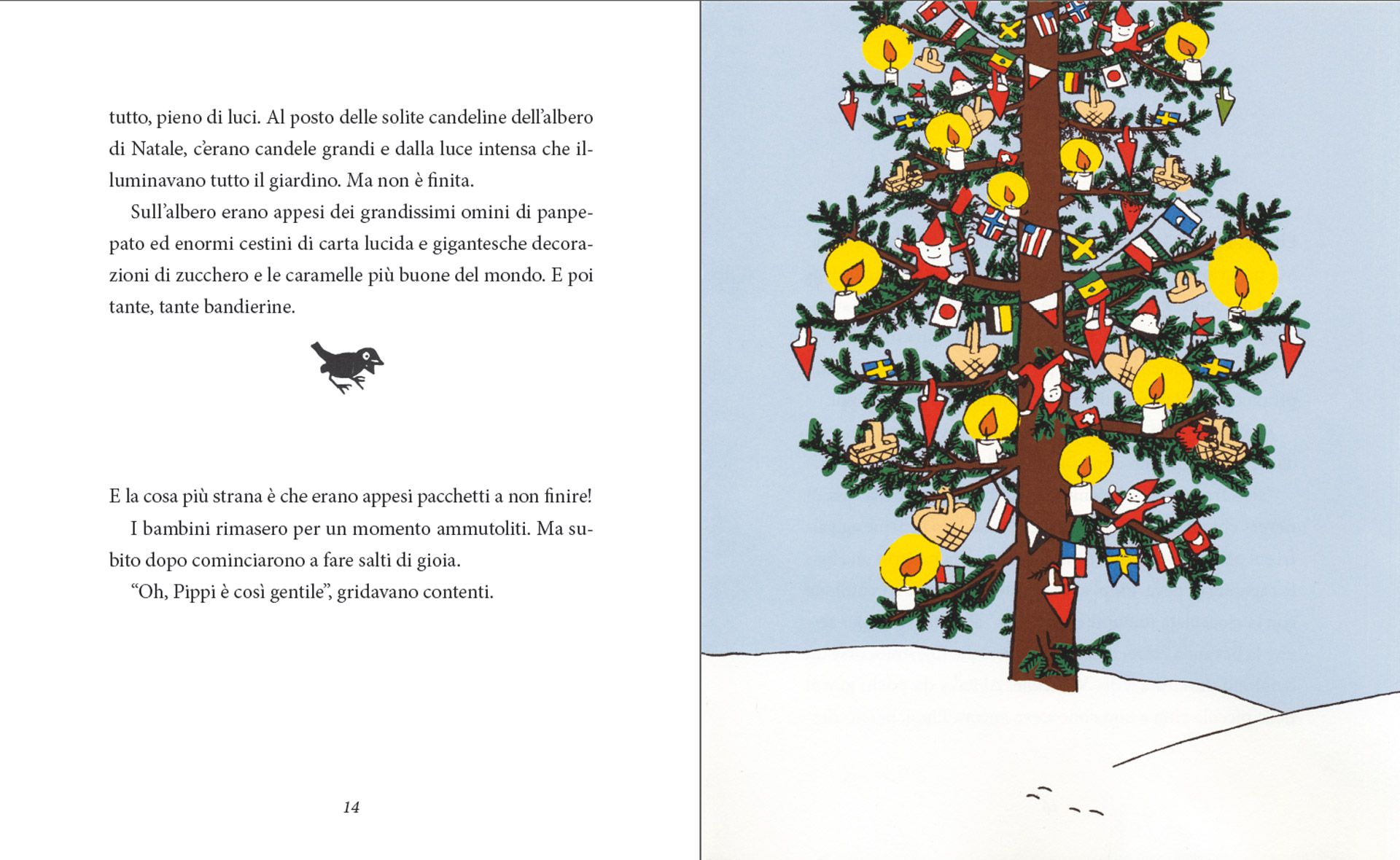Sono episodi che mettono in luce il cuore grande di Pippi che, tra una stramberia e l’altra, sprizza generosità. (…)la Lindgren è maestra nel condurci con estrema naturalezza accanto ai bambini che ora “slittano senza la slitta” sul tetto di Villa Villacolle, poi ballano e cantano attorno all’albero di Natale, e infine scartano i doni appesi all’abete. – Galline Volanti