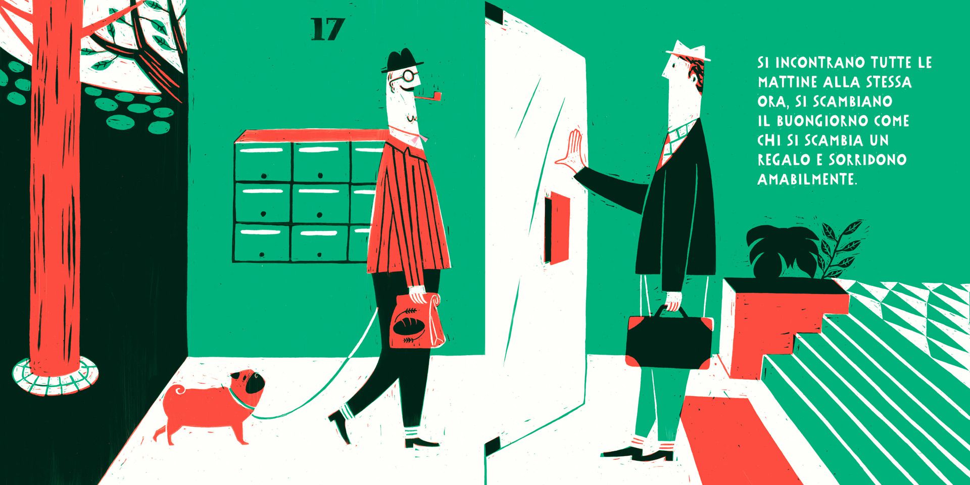 Un albo raccontato dalla voce di un bambino che descrive la quotidianità e gli interessi del nonno in contrapposizione alla vita del suo vicino di casa. Un contrasto evidenziato da un sapiente uso dei colori e della grafica.